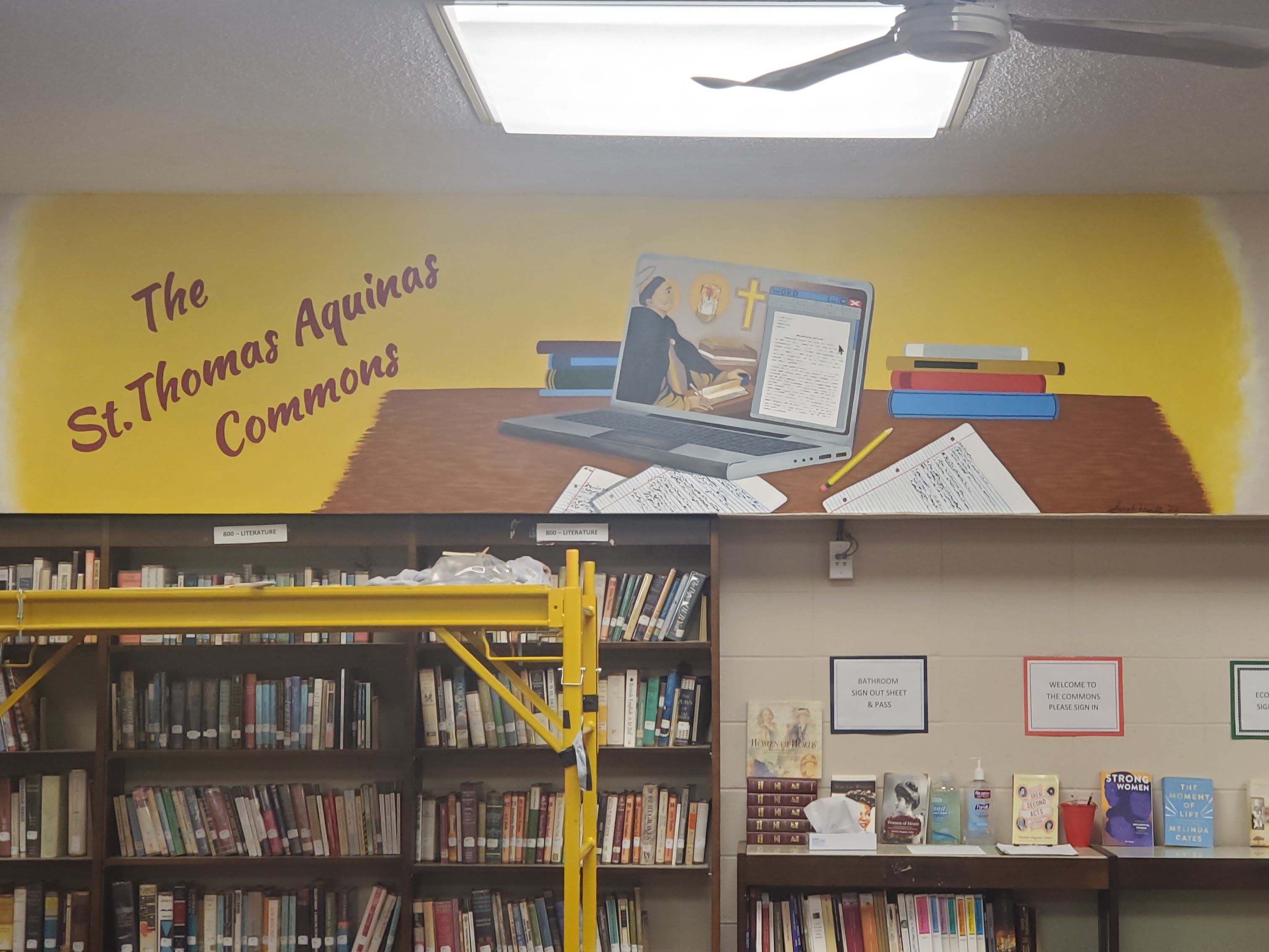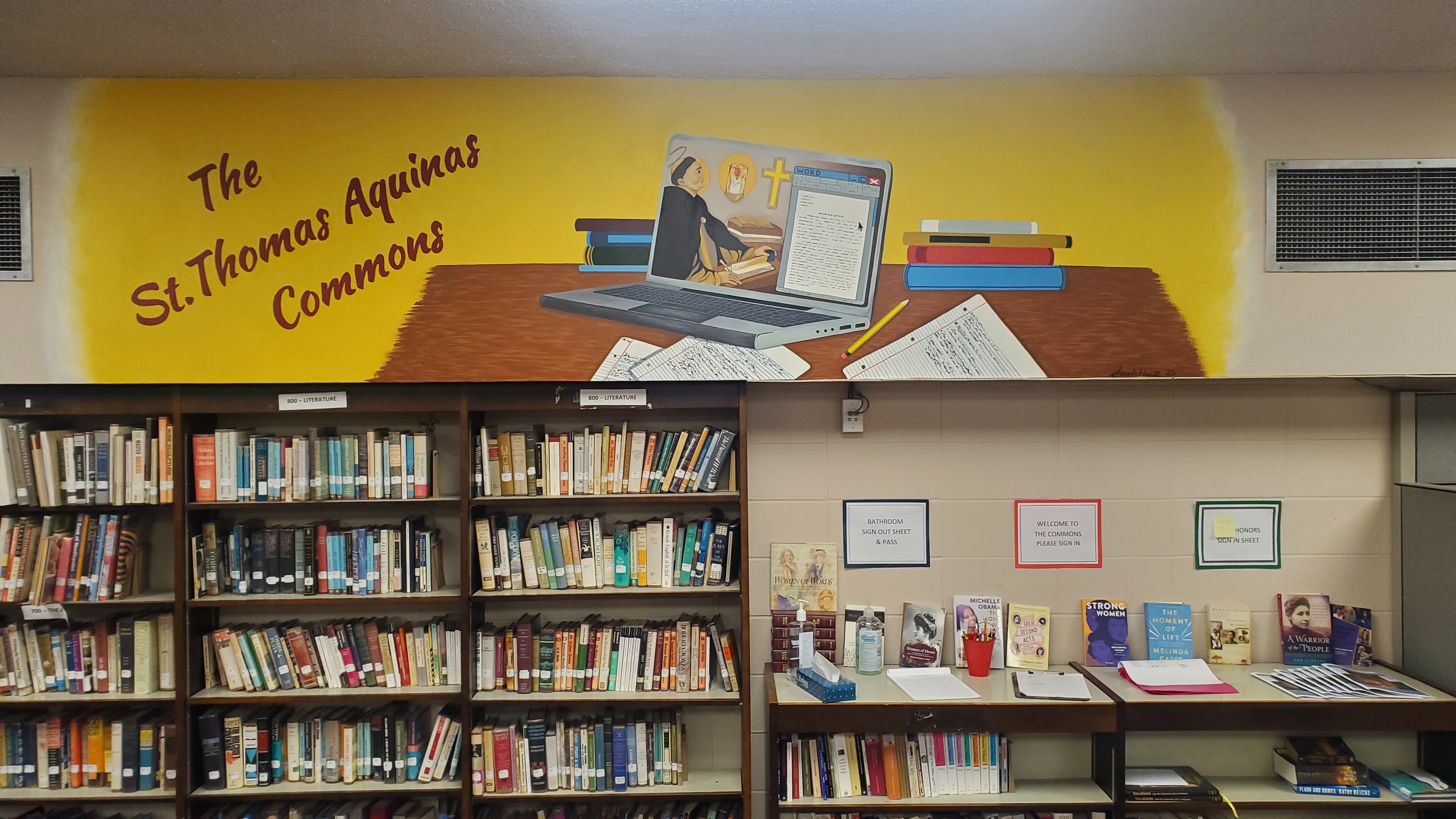 This mural was designed to represent the legacy of St. Thomas Aquinas as a seeker of knowledge, to commemorate the renovation of the school library into a true 21st century library and research center. St. Thomas Aquinas himself is depicted here as the background on the laptop displayed in the painting (representing him as a source of inspiration), while the hypothetical student works on a paper with all the tools and resources available to them as they conduct their research.