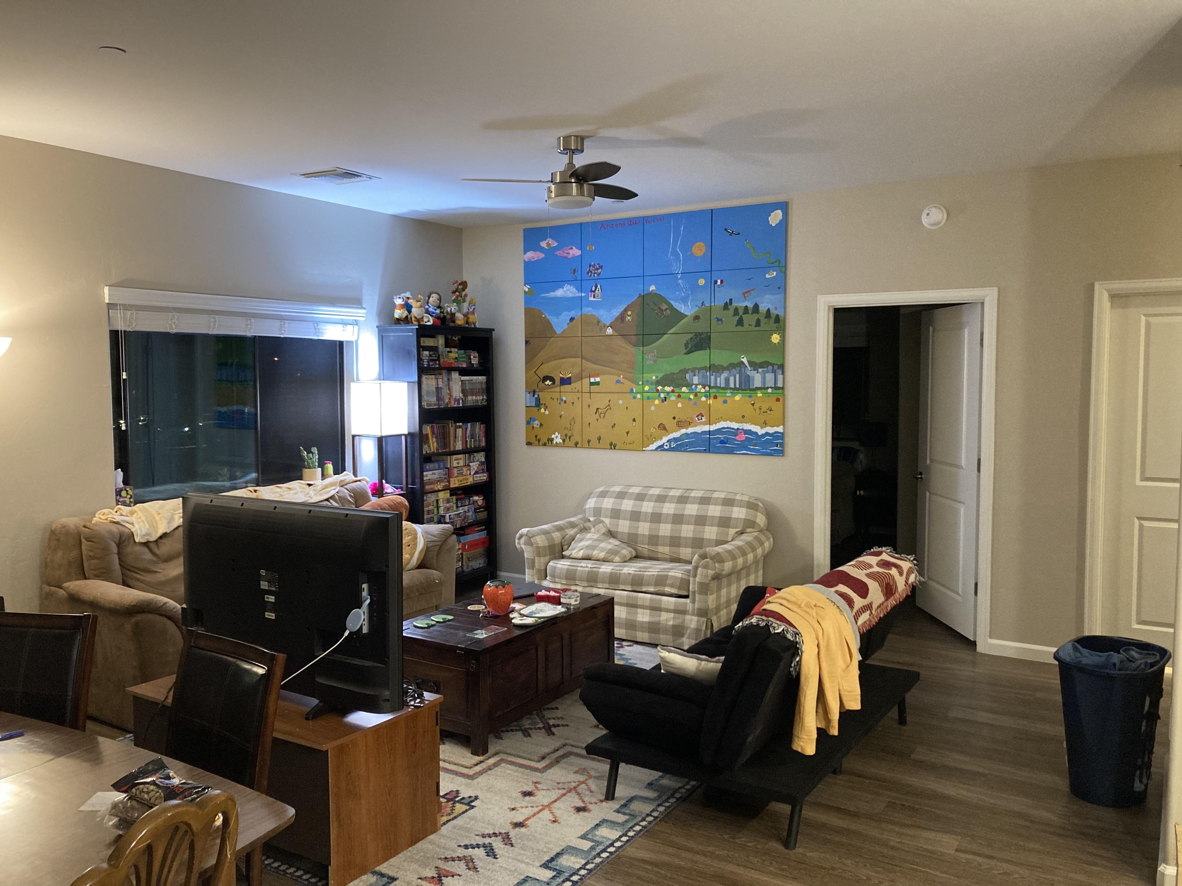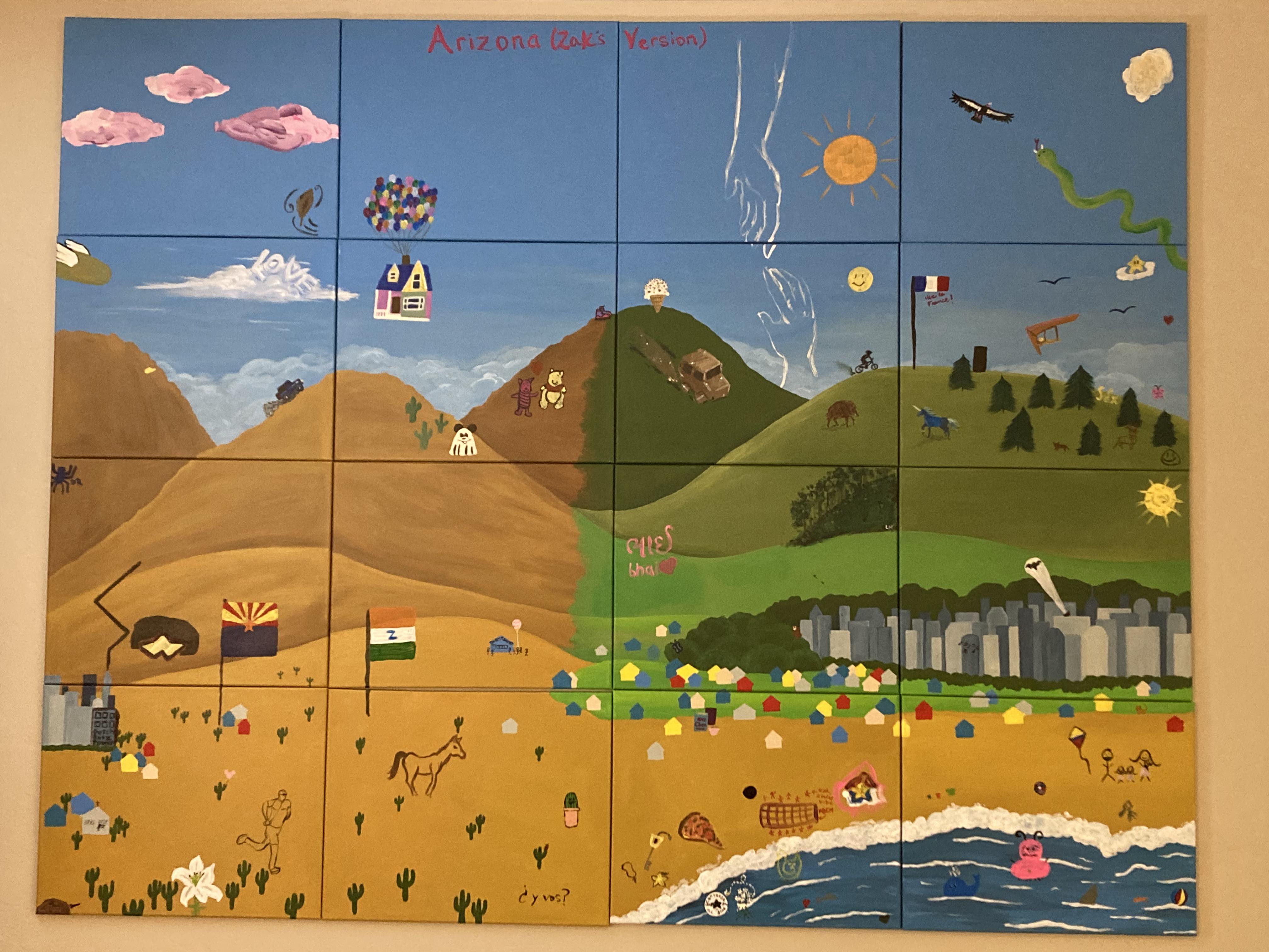 I painted the background for this mural to represent the fusion of New Jersey and Arizona for my friend who was moving from NJ to Arizona. He had me paint the background, then had guests at his going-away party add onto the mural with things that are symbolic of their relationship or depict memories they have had with him. The first picture is of the background which I painted, and the next two photos show the completed project hanging in its space, with all of the collaborative additions made by others.