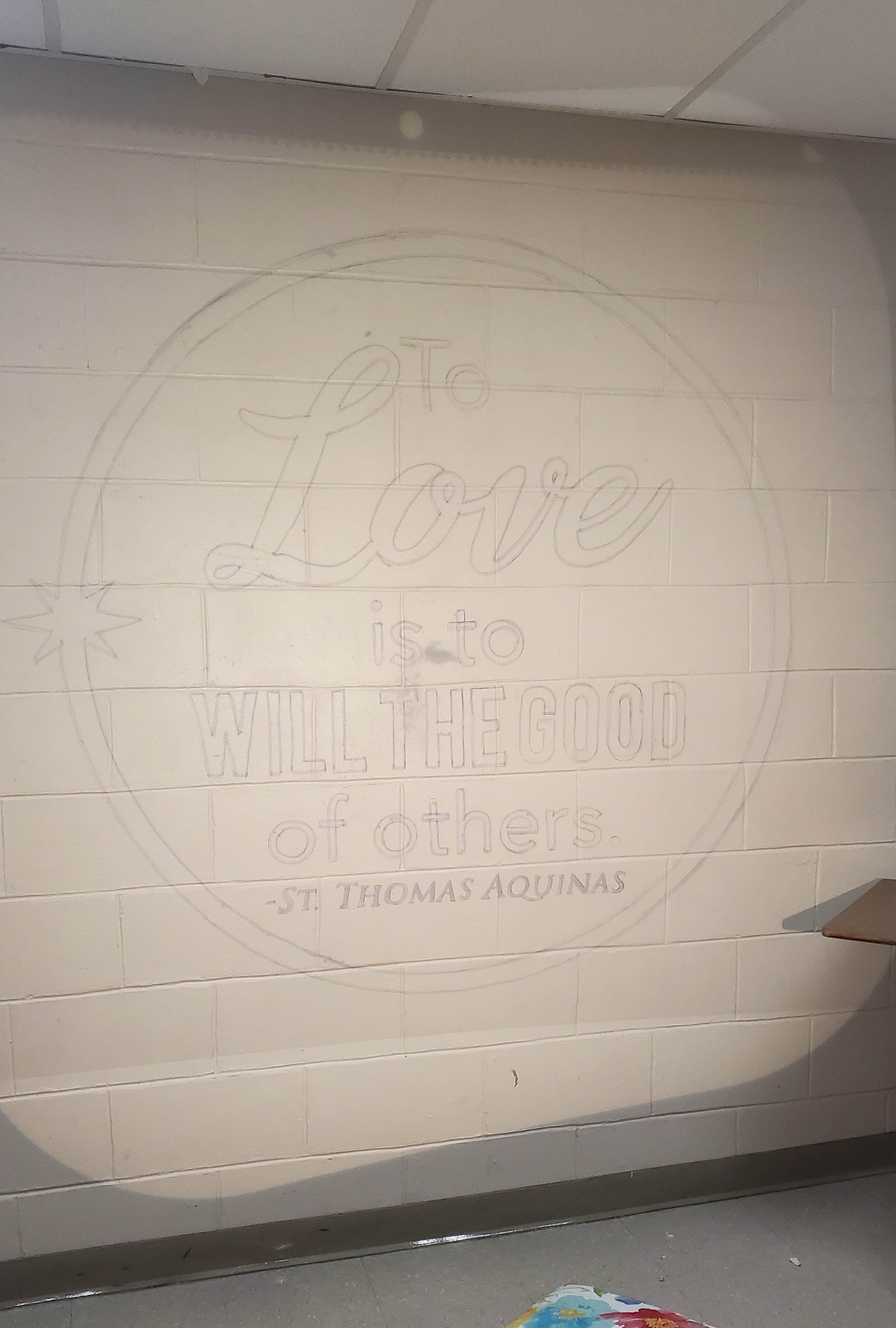 I painted this mural based on a computer design of a quote my St. Thomas Aquinas. I started by projecting this design onto the wall, tracing the outlines, and then painting. This mural took approximately 10-12 hours to complete from initial tracing to painting and cleanup.